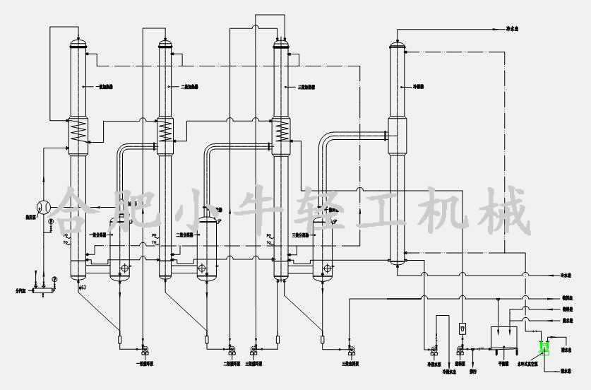 三效降膜蒸發(fā)器成套系統(tǒng)主要包括各效加熱器、各效蒸發(fā)分離器、預(yù)熱器、冷凝器、凝水罐、各物料泵、冷凝水泵、真空泵、設(shè)備平臺、電控系統(tǒng)、管路系統(tǒng)等部件。