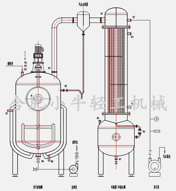 合肥小牛真空減壓濃縮器加熱形式可根據(jù)用戶工況設(shè)計為蒸汽加熱式或電加熱式,滿足無鍋爐熱源的用戶使用。真空濃縮罐設(shè)有夾套及保溫層,夾套內(nèi)通入蒸汽(蒸汽加熱式)或?qū)嵊停娂訜崾剑┻M(jìn)行加熱,從而給濃縮罐內(nèi)物料間接傳熱,耐高溫保溫層能有效隔熱保溫,減少能耗,有效避免操作人員燙傷事故發(fā)生。罐體配有視鏡視燈,能夠隨時觀察罐內(nèi)狀態(tài)。生產(chǎn)完成后,利用CIP自動旋轉(zhuǎn)清洗球能夠?qū)迌?nèi)進(jìn)行360度沖洗。特殊定制的攪拌裝置有效地避免了料液因濃度過高而出現(xiàn)的粘壁現(xiàn)象,攪拌裝置采用優(yōu)質(zhì)機(jī)械密封,確保不會因高真空而出現(xiàn)漏氣現(xiàn)象。真空濃縮罐內(nèi)物料受熱而產(chǎn)生的蒸汽中帶有有效成份的泡沫在汽液分離器中被分離出來通過管道回流至罐內(nèi),其余二次蒸汽通過列管式換熱器被冷凝成液體,進(jìn)入冷凝水收集罐,最后排出或回收利用,不凝性氣體隨真空泵一起排出。該設(shè)備可進(jìn)行負(fù)壓或常壓操作,也可以進(jìn)行連續(xù)或間歇生產(chǎn)。